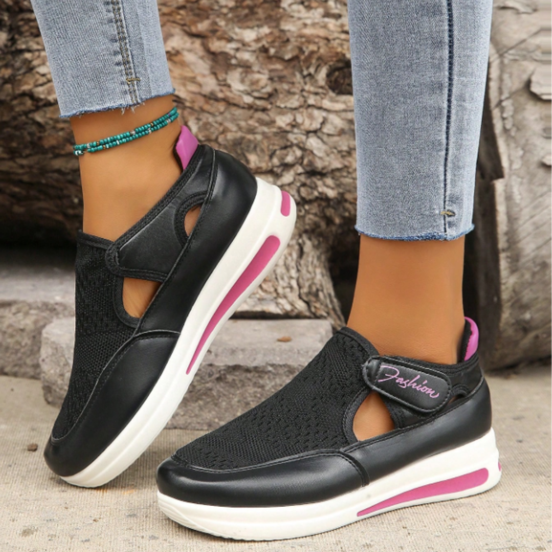 La maille ajourée permet une ventilation continue, gardant les pieds frais et secs en toutes saisons. Le bout arrondi et les découpes latérales apportent une touche contemporaine, tandis que la semelle décorée avec une ligne colorée et l’inscription « Fashion » souligne le style tendance de la paire
