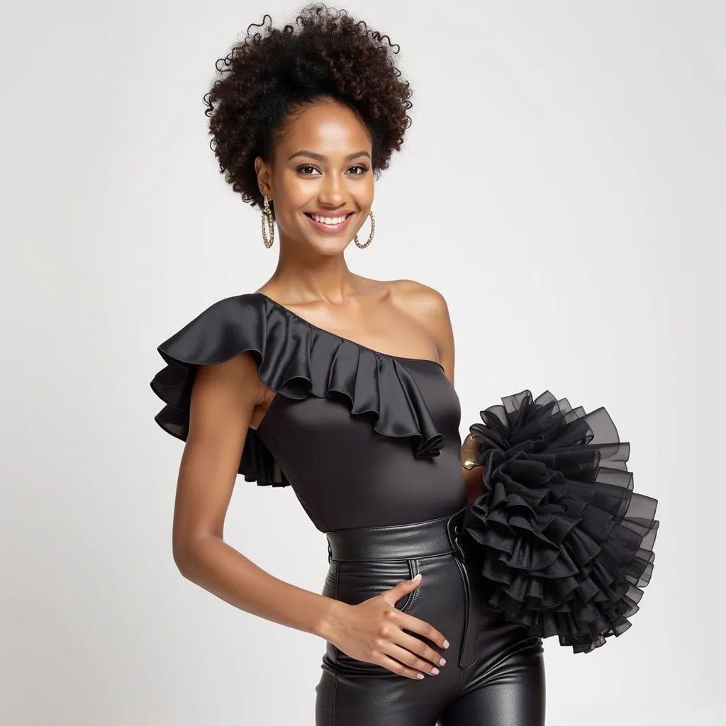 Le haut "Élégance Asymétrique" se distingue par sa coupe audacieuse et sophistiquée. Conçu pour mettre en valeur la féminité, il arbore une épaule dénudée ornée d'un élégant volant qui ajoute du mouvement et de la grâce. Idéal pour des soirées spéciales ou des événements où vous souhaitez briller avec élégance.