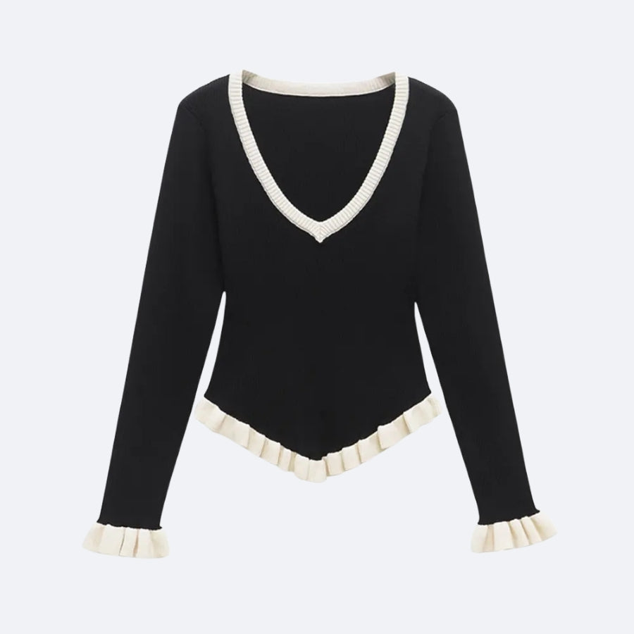 Ce pull noir se distingue par ses finitions crème volantées au niveau de l’ourlet et des poignets, apportant une touche raffinée et romantique.