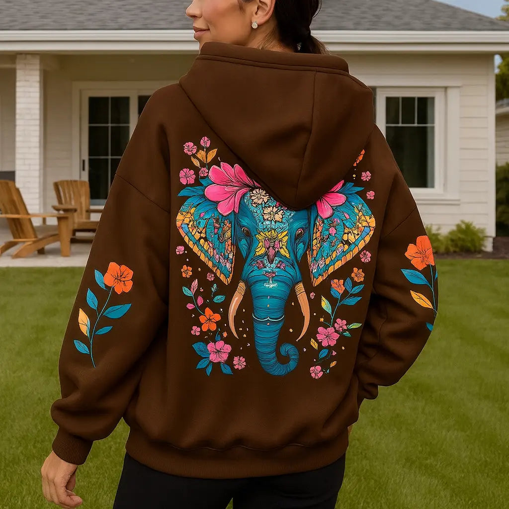Exprimez votre personnalité à travers le motif floral éléphant imprimé avec soin au dos — symbole de sérénité, de force et d’élégance. Chaque détail de ce sweat a été travaillé avec précision pour offrir un rendu artistique exceptionnel. Ses couleurs vibrantes et durables apportent une touche poétique et moderne à votre tenue, pour un look original et raffiné.